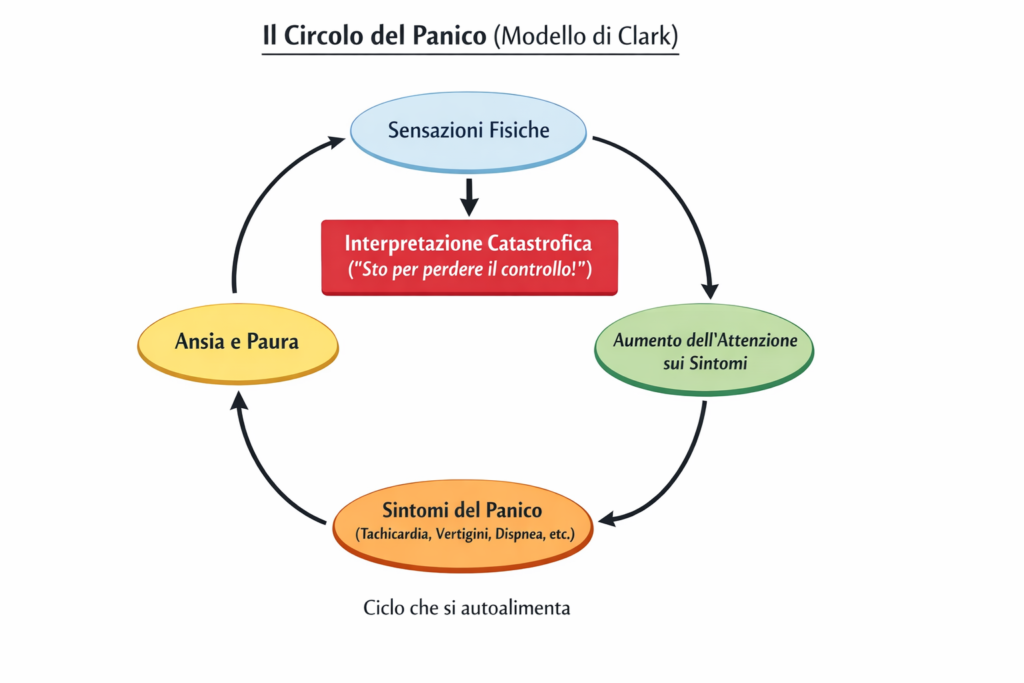 Queste interpretazioni amplificano la paura, la paura aumenta i sintomi fisici, e i sintomi confermano la paura. Si crea così un circolo vizioso che alimenta l’attacco di panico, rendendo tutto più intenso e spaventoso.